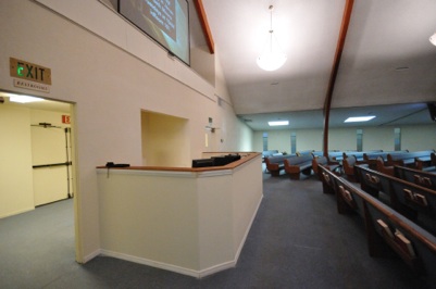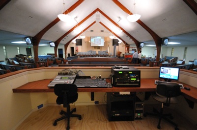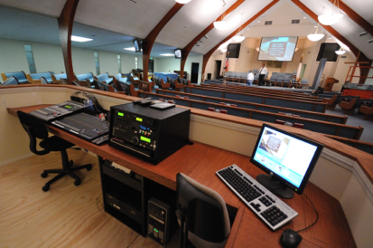 A new sound booth was built 6 feet into the room. Part of a retired pew was used to make the countertop. QSC KLA12 line array speaker provided sound for the main room, along with Yamaha IF series delay speakers for the side wing areas.